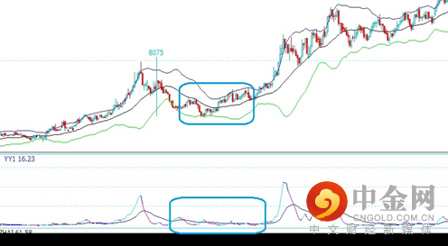 你可以在上图下面的一栏中,看到我们专门设计的跟踪市场波动率的YY1指标,它在安静的子宫中不断地收缩。YY1指标是我们设计用来探测市场胚胎胎音的B超。波动率在低位不断地收缩,为市场胚胎的发育提供了一个安静的环境,这就叫:环境好。