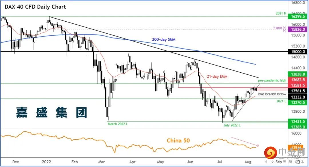 至于DAX指数本身,则在未能守住13680阻力位后调头向下: