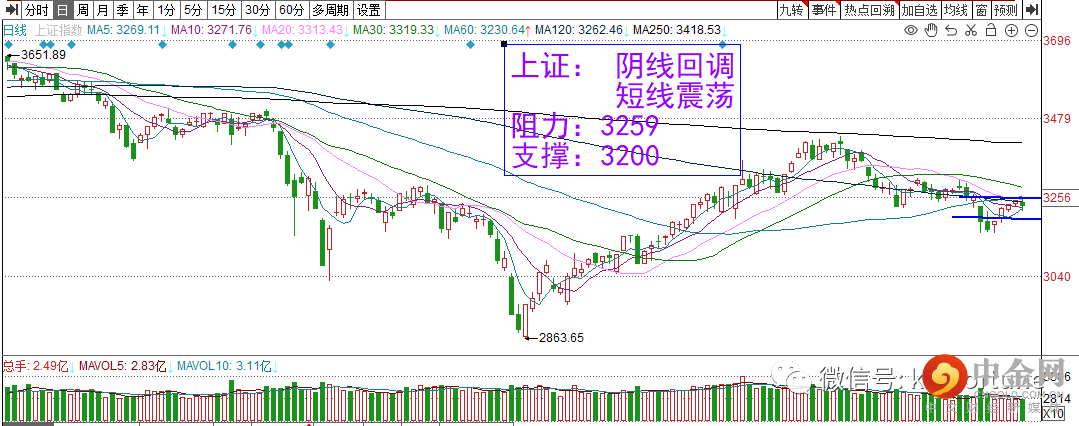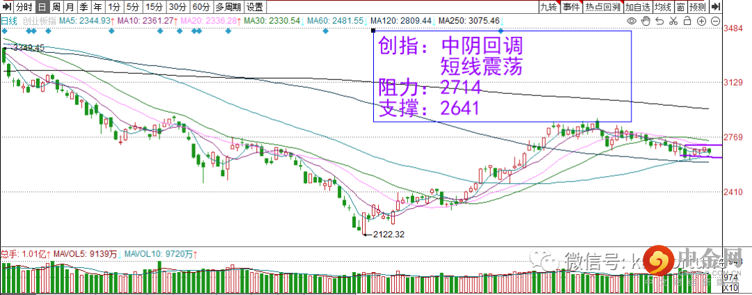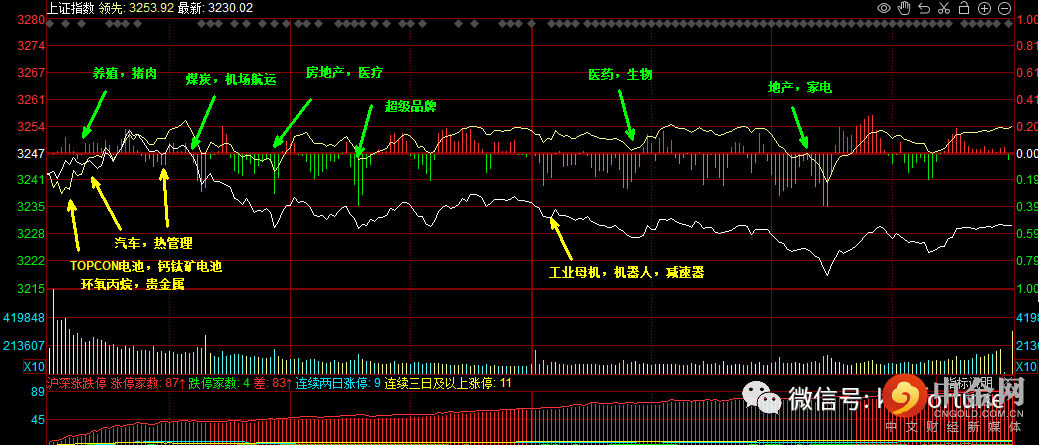 A股开盘三大指数集体低开,沪指低开0.16%,深成指低开0.23%,创指低开0.25%,汽车,非金属材料,小金属等板块高开,芯片半导体,煤炭,通信设备低开,开盘后TOPCON 电池,钙钛矿电池,环氧丙烷,贵金属拉升,随后新能源汽车,汽车热管理走强,储能10点半后拉升,养殖,猪肉开盘后继续下跌,煤炭,机场航运也下杀回调,房地产,医疗,超级品牌持续走弱,昨天大涨的先进封装(chiplet)早盘低开后拉升震荡,反复活跃。午盘后工业母机,机器人,减速器板块强势拉升,下午指数持续走弱,尾盘跌幅收窄。收盘沪指跌0.54%,深成指跌0.87%,创指跌1.34%。两市不到5成个股红盘,涨停个股88家,跌停个股4家。周二指数收小阳线,短线多头趋势良好。但今日指数开盘低开后,弱势反弹翻红不到10分钟,随后继续下跌,全天呈现单边下跌,主要是大蓝筹煤炭,机场,转基因板块调整,新能源光伏和汽车板块上涨,临近收盘指数下跌幅度收窄。今日收盘三大指数都收带下影的中阴线。沪指日图形态为红三兵后的回调,量能正常,短线会震荡,操作上不追涨,注意新能源板块间轮动,继续关注卫星导航机会。
