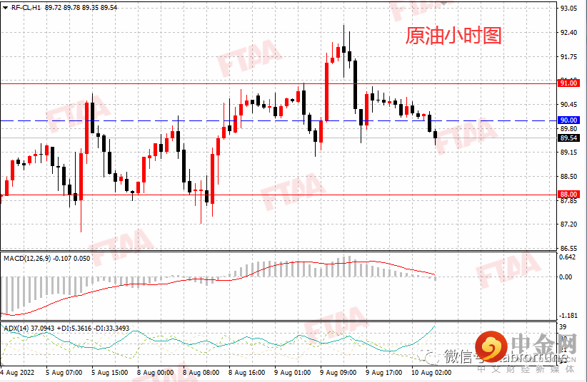 原油周二宽幅震荡,最低89.03,最高92.59,日图收出长上下影十字,显示短期多空暂时平衡,日图级别维持震荡。小时图看,昨日亚盘调整,欧盘和美盘拉升,美盘后段冲高回落。表明前期压力位92.50成波段阻力。今天亚盘继续下跌,结合当前ADX指标处于低位,日内震荡回调概率大。操作难度增大,策略上可观望,空仓为主。