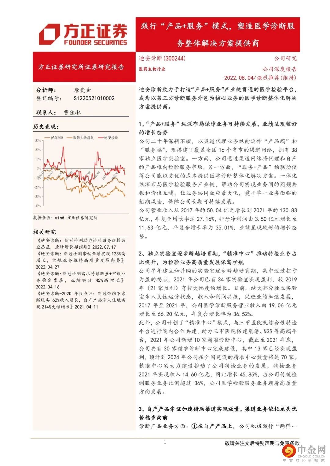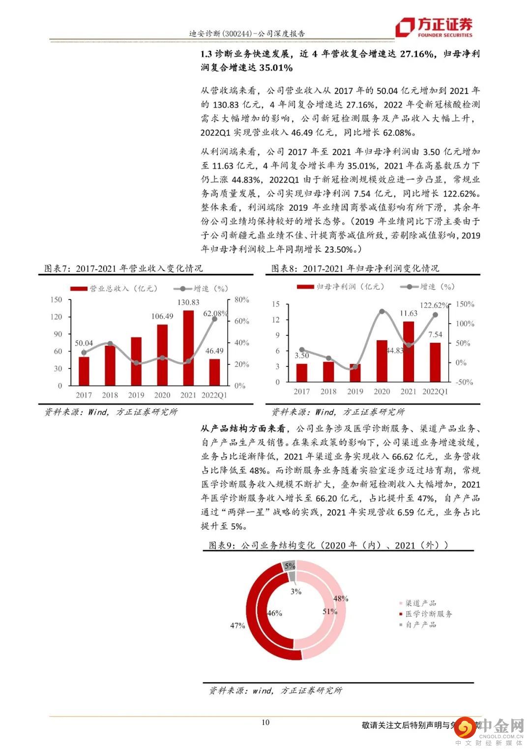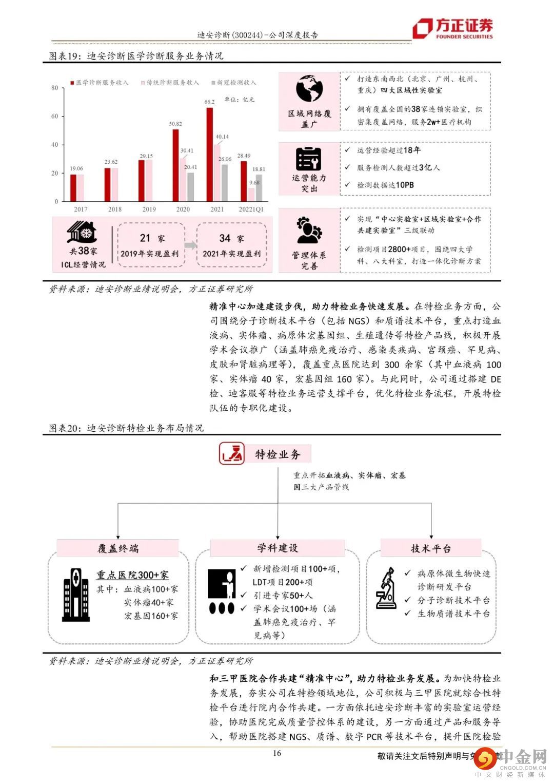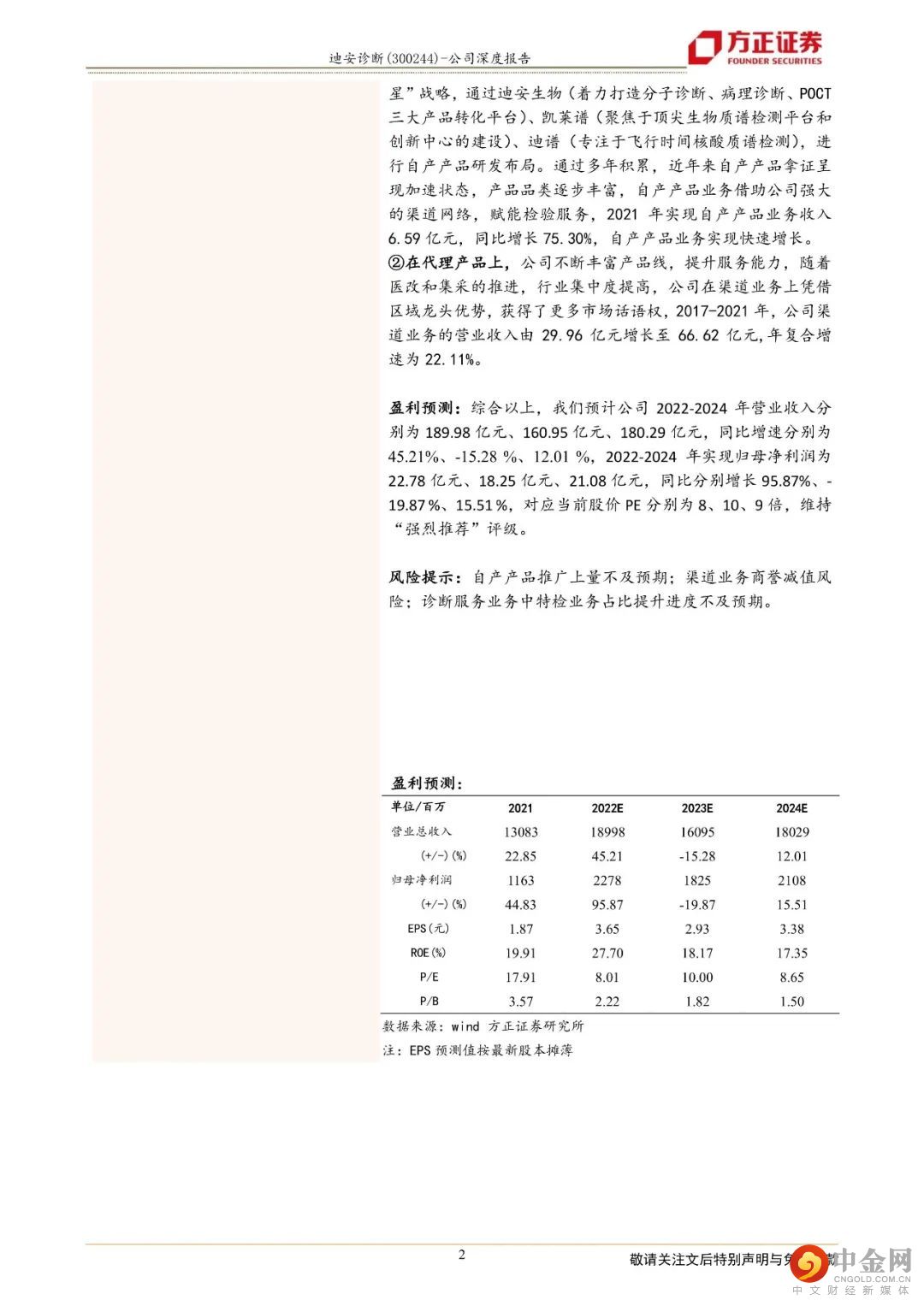 迪安诊断致力于打造“产品+服务”产业链贯通的医学检验平台,成为以第三方诊断服务外包为核心业务的医学诊断整体化解决方案提供商。1、“产品+服务”纵深布局保障业务可持续发展,业绩呈现较好的增长态势公司二十年深耕不辍,以渠道代理业务纵向延伸“产品端”和“服务端”,现搭建了覆盖全国16个省市的渠道网络,拥有38家独立医学实验室。一方面,公司通过渠道网络将代理和自产的产品推向检验服务市场,另一方面,“服务+产品”的联动使得公司能以更优的成本提供医学诊断整体化解决方案。一体化纵深布局医学检验服务产业链,帮助公司实现业务间的同频共振和价值互哺,让业务协同效应最大化,熨平单一业务面临的短期风险,保障公司长期可持续发展。2、独立实验室逐步跨越培育期,“精准中心”推动特检业务占比提升,为检验业务高质量发展保驾护航公司早年建立和并购的实验室逐步跨越培育期,集中迈过扭亏为盈的拐点,2021年公司已有34家实验室实现盈利,较2019年(21家盈利)有较大幅度的增长。目前,绝大部分独立实验室步入良性运营状态,收入和利润共振,促进业绩加速发展,2017年至2021年,公司医学诊断服务营业收入由19.06亿元增长至66.20亿元,年复合增长率为36.52%。特检业务2021年实现收入14.60亿元,同比增长45.85%,占公司传统检测服务业务比例超过36%,公司医学检验服务业务朝着高质量方向发展。3、自产产品拿证加速借助渠道实现放量,渠道业务依托龙头优势稳步向前自产产品业务借助公司强大的渠道网络,赋能检验服务,2021年实现收入6.59亿元,同比增长75.30%,自产产品业务实现快速增长。公司渠道业务的营业收入由29.96亿元增长至66.62亿元,年复合增速为22.11%,稳步向前。盈利预测:综合以上,我们预计公司2022-2024年营业收入分别为189.98亿元、160.95亿元、180.29亿元,同比增速分别为45.21%、-15.28 %、12.01 %,2022-2024年实现归母净利润为22.78亿元、18.25亿元、21.08亿元,同比分别增长95.87%、-19.87 %、15.51 %,对应当前股价PE分别为8、10、9倍,维持“强烈推荐”评级。风险提示:自产产品推广上量不及预期;渠道业务商誉减值风险;诊断服务业务中特检业务占比提升进度不及预期。
