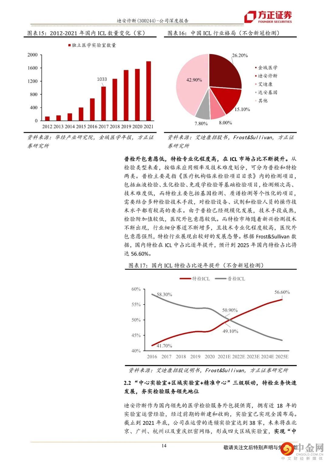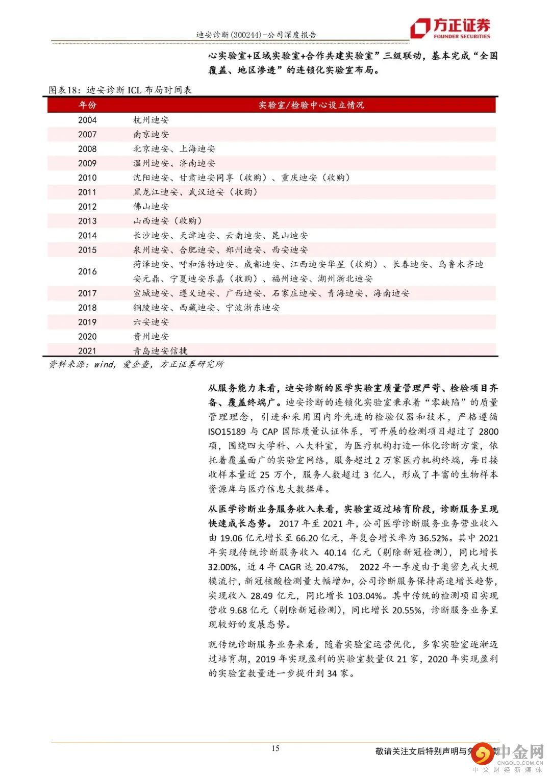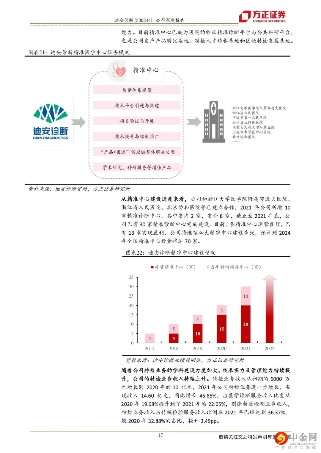 迪安诊断致力于打造“产品+服务”产业链贯通的医学检验平台,成为以第三方诊断服务外包为核心业务的医学诊断整体化解决方案提供商。1、“产品+服务”纵深布局保障业务可持续发展,业绩呈现较好的增长态势公司二十年深耕不辍,以渠道代理业务纵向延伸“产品端”和“服务端”,现搭建了覆盖全国16个省市的渠道网络,拥有38家独立医学实验室。一方面,公司通过渠道网络将代理和自产的产品推向检验服务市场,另一方面,“服务+产品”的联动使得公司能以更优的成本提供医学诊断整体化解决方案。一体化纵深布局医学检验服务产业链,帮助公司实现业务间的同频共振和价值互哺,让业务协同效应最大化,熨平单一业务面临的短期风险,保障公司长期可持续发展。2、独立实验室逐步跨越培育期,“精准中心”推动特检业务占比提升,为检验业务高质量发展保驾护航公司早年建立和并购的实验室逐步跨越培育期,集中迈过扭亏为盈的拐点,2021年公司已有34家实验室实现盈利,较2019年(21家盈利)有较大幅度的增长。目前,绝大部分独立实验室步入良性运营状态,收入和利润共振,促进业绩加速发展,2017年至2021年,公司医学诊断服务营业收入由19.06亿元增长至66.20亿元,年复合增长率为36.52%。特检业务2021年实现收入14.60亿元,同比增长45.85%,占公司传统检测服务业务比例超过36%,公司医学检验服务业务朝着高质量方向发展。3、自产产品拿证加速借助渠道实现放量,渠道业务依托龙头优势稳步向前自产产品业务借助公司强大的渠道网络,赋能检验服务,2021年实现收入6.59亿元,同比增长75.30%,自产产品业务实现快速增长。公司渠道业务的营业收入由29.96亿元增长至66.62亿元,年复合增速为22.11%,稳步向前。盈利预测:综合以上,我们预计公司2022-2024年营业收入分别为189.98亿元、160.95亿元、180.29亿元,同比增速分别为45.21%、-15.28 %、12.01 %,2022-2024年实现归母净利润为22.78亿元、18.25亿元、21.08亿元,同比分别增长95.87%、-19.87 %、15.51 %,对应当前股价PE分别为8、10、9倍,维持“强烈推荐”评级。风险提示:自产产品推广上量不及预期;渠道业务商誉减值风险;诊断服务业务中特检业务占比提升进度不及预期。