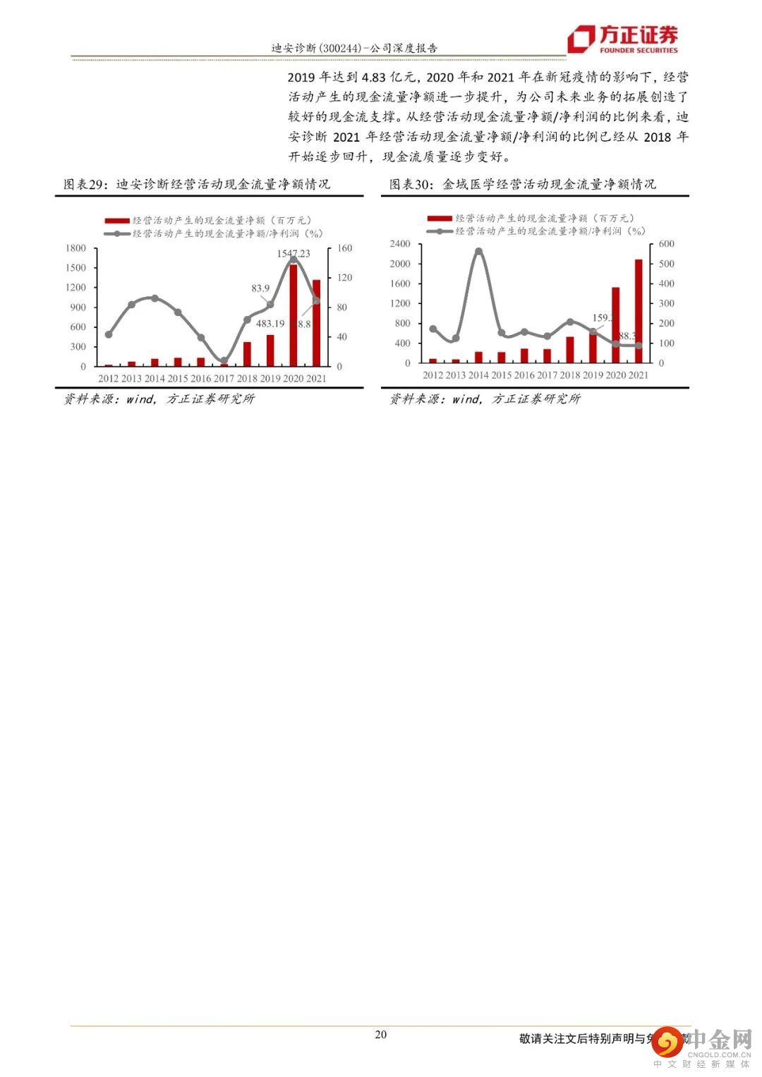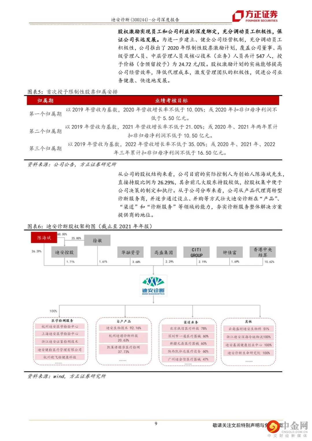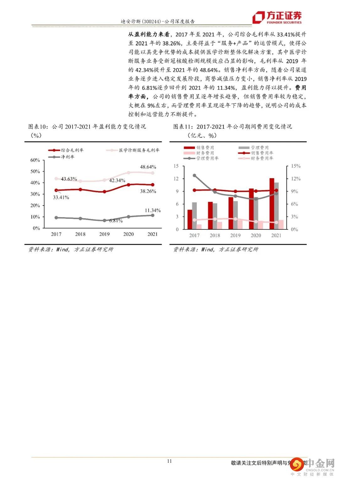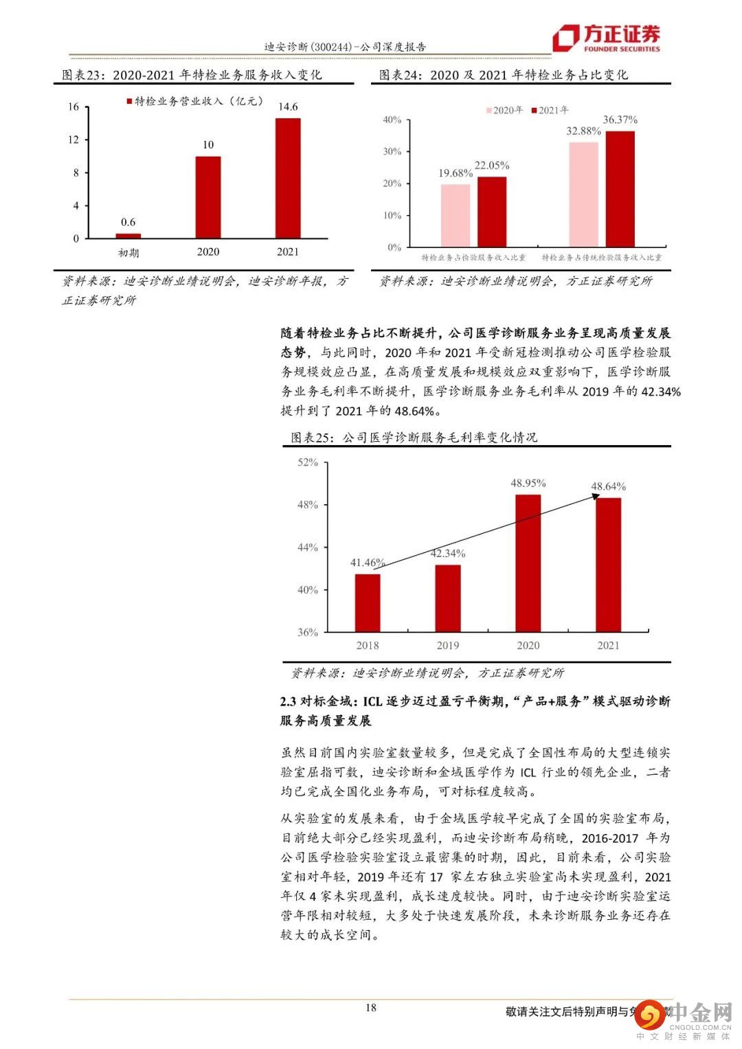 迪安诊断致力于打造“产品+服务”产业链贯通的医学检验平台,成为以第三方诊断服务外包为核心业务的医学诊断整体化解决方案提供商。1、“产品+服务”纵深布局保障业务可持续发展,业绩呈现较好的增长态势公司二十年深耕不辍,以渠道代理业务纵向延伸“产品端”和“服务端”,现搭建了覆盖全国16个省市的渠道网络,拥有38家独立医学实验室。一方面,公司通过渠道网络将代理和自产的产品推向检验服务市场,另一方面,“服务+产品”的联动使得公司能以更优的成本提供医学诊断整体化解决方案。一体化纵深布局医学检验服务产业链,帮助公司实现业务间的同频共振和价值互哺,让业务协同效应最大化,熨平单一业务面临的短期风险,保障公司长期可持续发展。2、独立实验室逐步跨越培育期,“精准中心”推动特检业务占比提升,为检验业务高质量发展保驾护航公司早年建立和并购的实验室逐步跨越培育期,集中迈过扭亏为盈的拐点,2021年公司已有34家实验室实现盈利,较2019年(21家盈利)有较大幅度的增长。目前,绝大部分独立实验室步入良性运营状态,收入和利润共振,促进业绩加速发展,2017年至2021年,公司医学诊断服务营业收入由19.06亿元增长至66.20亿元,年复合增长率为36.52%。特检业务2021年实现收入14.60亿元,同比增长45.85%,占公司传统检测服务业务比例超过36%,公司医学检验服务业务朝着高质量方向发展。3、自产产品拿证加速借助渠道实现放量,渠道业务依托龙头优势稳步向前自产产品业务借助公司强大的渠道网络,赋能检验服务,2021年实现收入6.59亿元,同比增长75.30%,自产产品业务实现快速增长。公司渠道业务的营业收入由29.96亿元增长至66.62亿元,年复合增速为22.11%,稳步向前。盈利预测:综合以上,我们预计公司2022-2024年营业收入分别为189.98亿元、160.95亿元、180.29亿元,同比增速分别为45.21%、-15.28 %、12.01 %,2022-2024年实现归母净利润为22.78亿元、18.25亿元、21.08亿元,同比分别增长95.87%、-19.87 %、15.51 %,对应当前股价PE分别为8、10、9倍,维持“强烈推荐”评级。风险提示:自产产品推广上量不及预期;渠道业务商誉减值风险;诊断服务业务中特检业务占比提升进度不及预期。