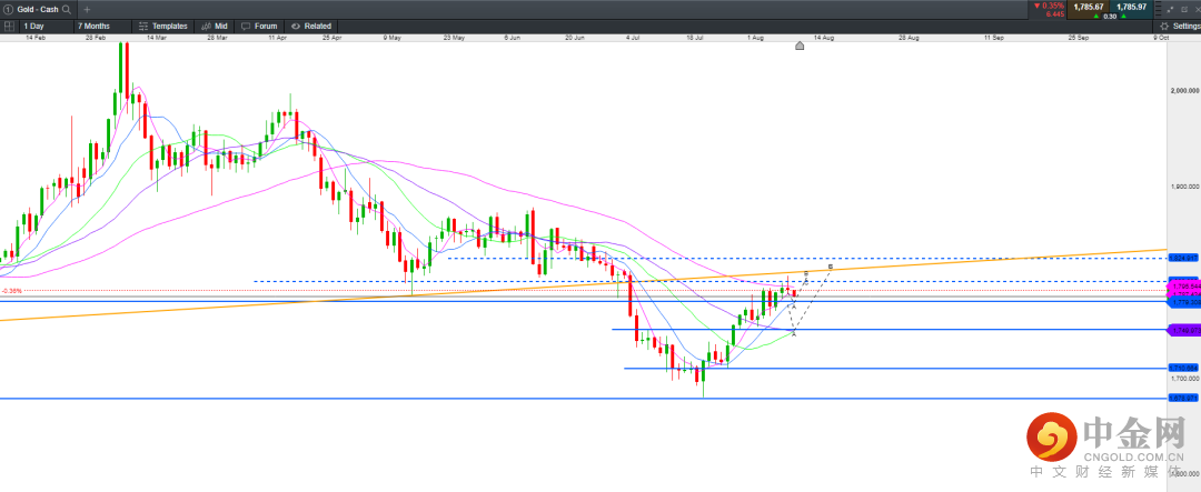 今日亚盘金价表现低迷,因此价格存在进一步的回落风险,短期支撑关注1780附近,若跌穿该点位,价格或进一步下行试探1750。