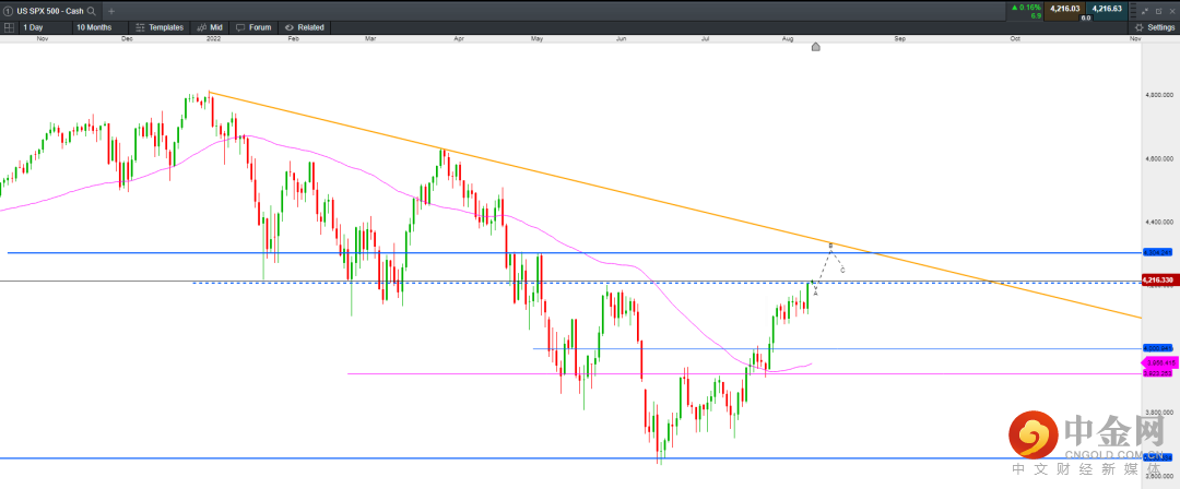 因通胀的超预期回落引发了市场对9月加息75bps的预期的大幅度下滑,据CME的FED Watch显示9月加息75bps的概率为42.5%,此前曾超70%。加息放缓的预期升高刺激了美股直线拉升。标普500指数突破4200大关,目前运行于4220附近。