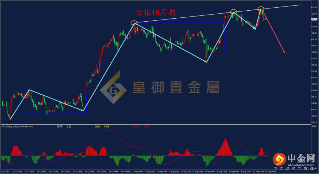 白银昨日在美盘时段小幅上涨,在涨至20.80附近后受阻回落。从1H周期走势结构看,白银自18.23附近上涨,走出明显5波上行结构,按波浪理论走势规律,5波走势结构后通常反转,白银目前在20.75附近多次受阻有反转可能。结合MACD指标来看,价格连创新高,但DIFF线与DEA线并未创出新高,同时红色能量柱面积也在缩小,表明多头力量不足,日内可在20.60附近尝试空单。