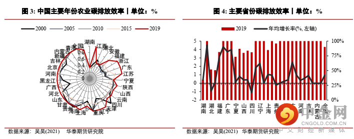 以农业为例,2000−2019 年, 中国农业碳排放效率平均水平为 0.778, 表明在对应技术水平与投入要素条件下还可减少 22.2% 的农业碳排放量(见图3和图4), 具备较大减排潜力[10]。