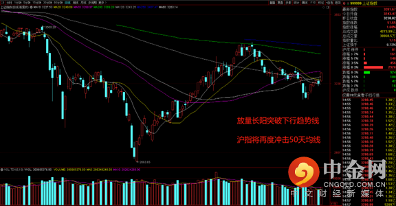 沪指在近期连续缩量运行后,昨天终于呈现出放量格局,且在量价配合良好的情况下走出了一根饱满的中阳线,一举突破短期下行趋势线的压制。毫无疑问这是近期市场非常积极的动作之一,目前市场来到50天中期均线下方,市场能否乘胜追击收复50天中期均线,对市场中长期资金的沉淀具有重要意义。