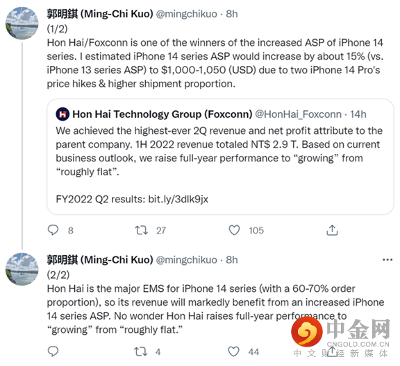 消息面上,8月10日晚间天风国际分析师郭明錤通过社交媒体表示,与 iPhone 13 系列相比,预计苹果 iPhone 14 系列 ASP(Average Selling Price,平均售价)将上涨 15% 左右。