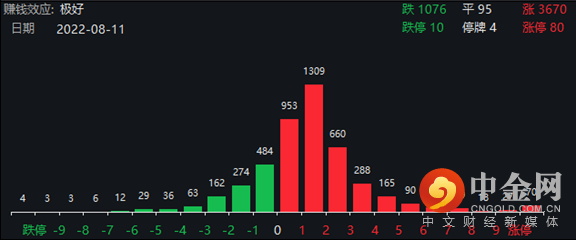 个股方面,市场在权重题材双活跃的氛围下赚钱效应极好。3670家个股上涨,1076家个股下跌,80家个股涨停。
