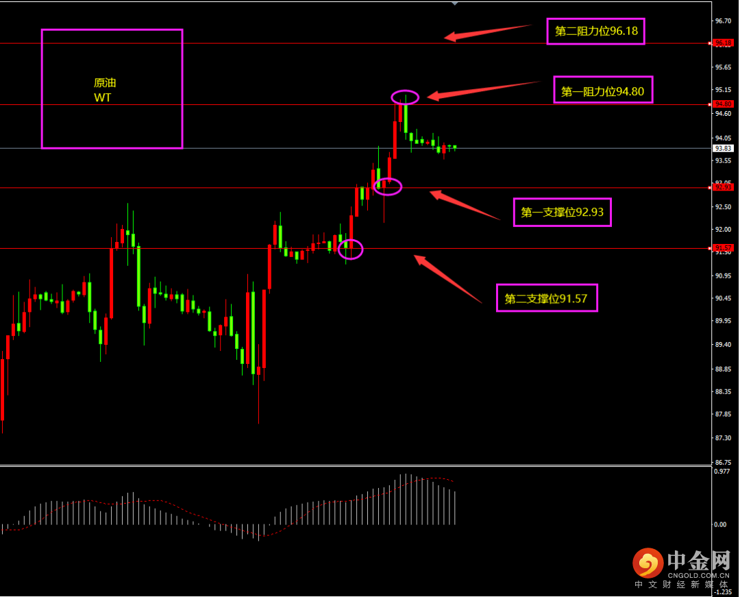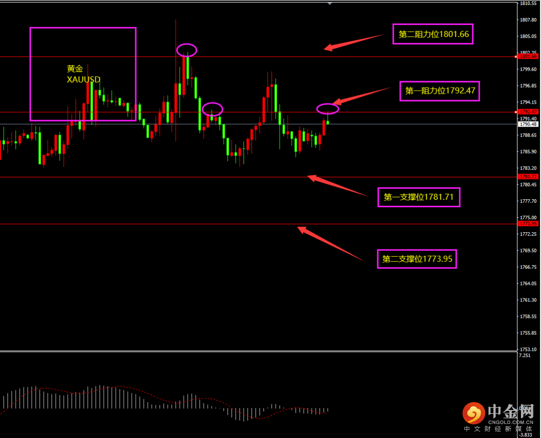 天图黄金收小阴线,价格小幅回落,空头有所增强,短期MACD位于0轴附近,多空处在调整阶段,且连续冲高面临调整,日内更多试探性以逢高看空为主。小时图黄金期间连续阴线下滑,MACD位于0轴之下,空头占优,短期底部有部分阳线维稳,多头仍在,日内更多试探性以逢高看空为主?(仍有创新高可能性)