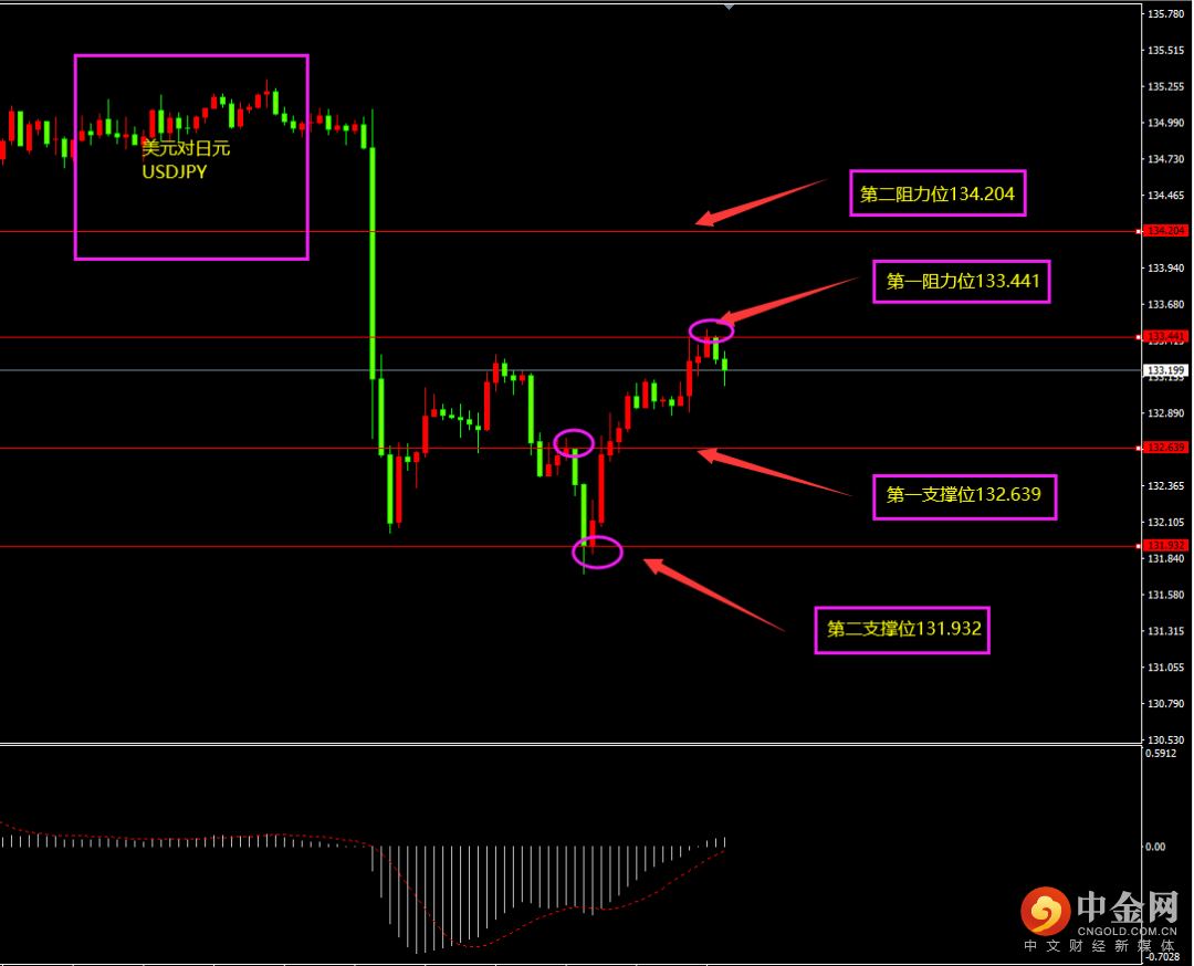 天图美日收小阳线,价格小幅冲高,多头有所增强,下影线较长,下行空头遭受多头反扑,且下方震荡低位不破,支撑仍在,日内更多以逢低看多为主。小时图美日期间连续阳线拉升,MACD位于0轴之上,多头占优,短期上方无大阴线回落,空头较弱,日内更多以震荡以及震荡上行为主?
