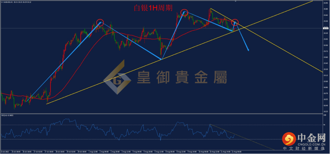白银昨日小幅反弹后再次受阻下跌,目前处于高位震荡当中,20.50一线作为周线级别重要的多空分水岭,近期成为争夺的焦点,今日周线收线,如果周K线未能站上20.50-20.60一线,则表明白银仍在空头掌握之中,目前1小时RSI下降趋势线压力明显,也为白银多头带来阻力,今日可重点关注上方20.50一线压力,如有冲高受阻,可轻仓尝试空单。
