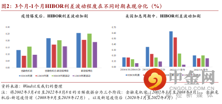 3个月-1个月HIBOR利差围绕对应期限LIBOR利差呈现双向波动。年初至今(截至2022年8月8日),3个月-1个月HIBOR利差从11个基点扩大至78个基点。从利差整体水平来看,3个月与1个月LIBOR利差(LIBOR利差)水平决定了3个月与1个月HIBOR利差(HIBOR利差)波动的中枢水平。依据历史数据,HIBOR利差基本上围绕着LIBOR利差上下波动,两者相关性为0.68(在1%置信区间下显著)。在控制其他可能的影响因素(例如,美国联邦基金利率、美元指数、恒生指数、本地银行体系总结余)后,计量模型结果显示若LIBOR利差扩大1个单位,则HIBOR利差会随之边际扩大0.84个单位。从利差波动水平来看,整体而言,HIBOR利差均略阔于同期LIBOR利差,且HIBOR利差波动幅度比LIBOR利差波动幅度更大。具体来看,在金融危机爆发后、疫情爆发后,无论是HIBOR利差波动还是LIBOR利差波动都愈发剧烈;美国加息周期之中,HIBOR利差波动水平均远高于同期LIBOR利差波动水平。基于历史数据中HIBOR利差展现出的变化规律,将其拆解为利差中枢(即LIBOR利差)与利差偏离(HIBOR利差 – LIBOR利差)。