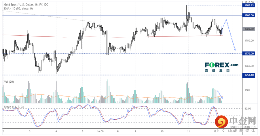 昨天我们指出金价在日图形成看跌锤子形态并给出看跌观点,这点保持不变,但小时图也呈现了反弹潜力。价格在50天指数移动均线处企稳,而且在价格下跌的同时成交量萎缩,表明空头兴趣缺缺。小时图出现了看涨吞噬K线,或已构筑期间波段低点。所以,金价可能在下破前展开小级别反击行情。日图方面,受制于1800的话继续看跌。
