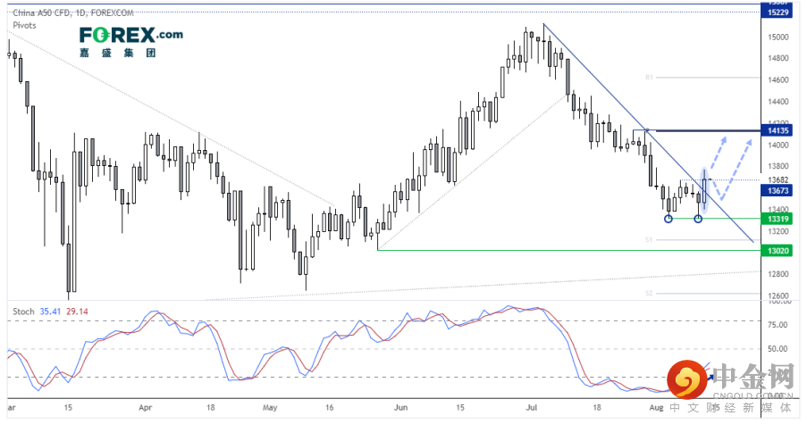 中国A50指数突破日图下降趋势线,暗示趋势转变。周三以看涨锤子形态在13,319构筑双底,后形成大阳线收上趋势线并探入13,679波段高点。随机震荡指标同样发出买入信号,目前追随价格上涨并脱离超卖区域。守住13,319继续看涨,亦可以趋势线辅助管理风险。现在我们认为,股指有潜力反击14,000,甚至月图枢轴位附近的14,135高点。