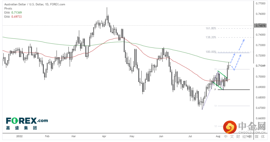 澳元/美元呈现强反弹走势,打破了潜在的旗形形态,剑指月图第二中枢支撑位附近的0.7238。但澳元/美元昨天高点未能攻破200天指数移动均线,继续上涨前或有小级别回撤的空间,而支撑位可能在月图第一中枢支撑。