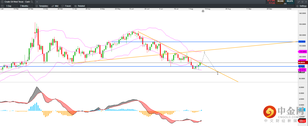 目前价格测试此前下行趋势的阻力,若价格能成功突破,企稳在94上方,价格或进一步反弹。