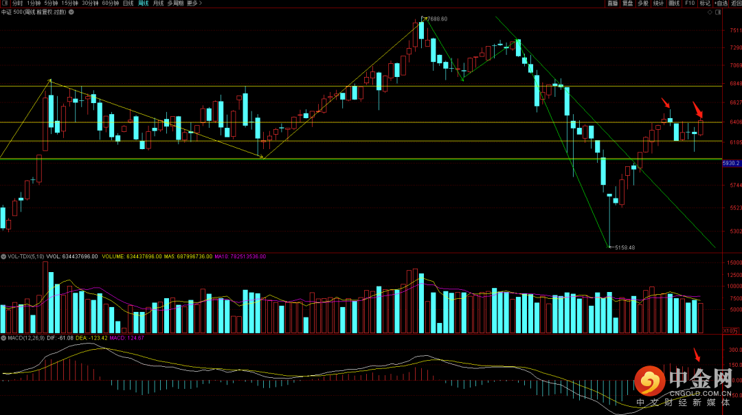 中证500表现强势,周线有向上扩张的走势,下周如果能继续向上有望突破前期高点。注意观察日线macd量柱,在没有出现再次收敛之前大概率有望延续反弹走势。
