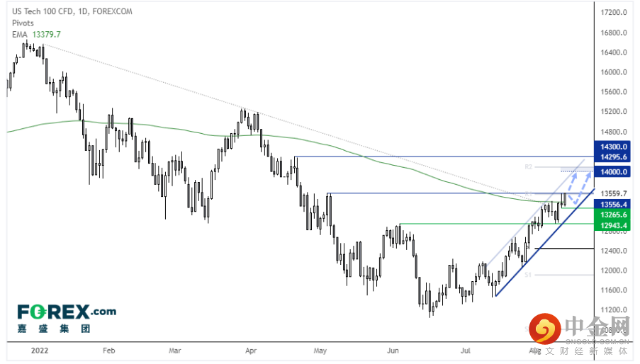 我们曾以为纳斯达克100指数将要筑顶并回落,但事实显然并非如此。股指上周五形成看涨吞噬K线,4月以来首度收上其200天指数移动均线,并且逼近5月高点下方不远处。日图如此强劲的趋势表明价格可能继续上攻,剑指14,295高点。如果站上13,562,涨势延续可期,目标先后指向14,000和14,300阻力区域。守住上升趋势线继续看涨,我们也可以利用上周五的低点对风险管理进行微调。