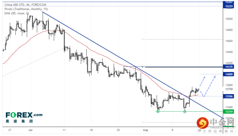 价格先在13,320附近构筑双底,后上破下降趋势线,4小时图目前在50期指数移动均线上方盘整。现在我们先后上看14,000 和 14,135,但若下破13,595,警示回调可能加剧。不过,守住13,319低点,我们继续看涨。