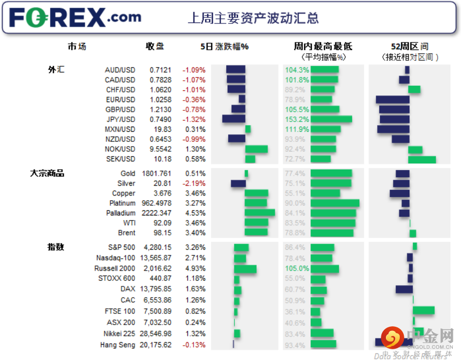 上周主要货币中,最强和最弱分别是澳新货币和美元。
