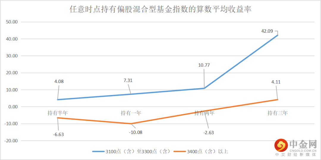 回测数据显示,在3100点至3300点买入并持有偏股混合型基金指数,每个时段获得的平均收益率都高于3400点以上买入。