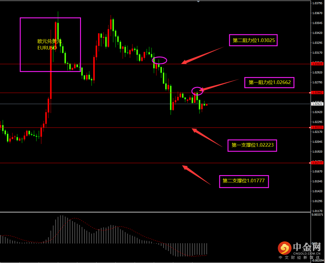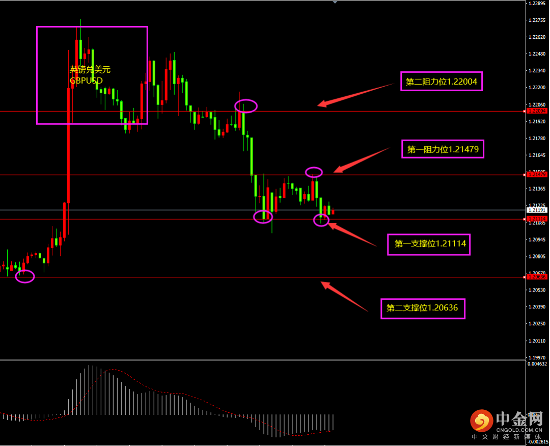 天图欧元收阴线,价格有所回落,空头有所增强,短期上行力度有所减弱,而MACD仍位于0轴之下,空头仍在,日内更多以逢高看空为主。小时图欧元期间连续阴线回落,MACD位于0轴之下,空头占优,短期底部无大阳线维稳,多头不强,日内更多以震荡以及震荡下行为主.