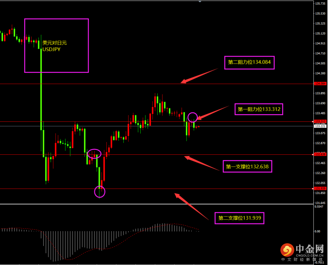 天图美日收小阳线,价格小幅冲高,但上影线较长,上行多头遭受空头打压,短期MACD位于0轴之下,空头仍在,日内更多以震荡带有一丝下行为主。小时图美日期间连续阴线回落,空头有所增强,短期MACD位于0轴附近,多空处在调整阶段,短期底部有阳线产生,多头仍在,日内更多以偏震荡为主。