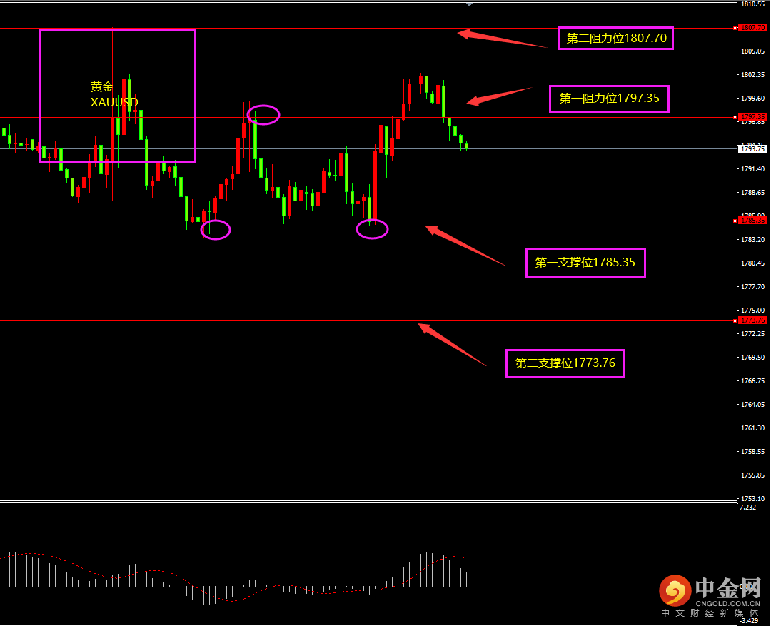 天图黄金收阳线,价格有所冲高,但并未破前期高点,且MACD位于0轴附近,多头力度不强,短期接近上方大阴线开盘价,阻力仍在,日内更多以逢高看空为主。小时图黄金一度冲高至1800以上,但上方有连续阴线回落,空头仍在,短期重回震荡区域,日内更多以逢高看空为主。(大阳线不出,多单不入)
