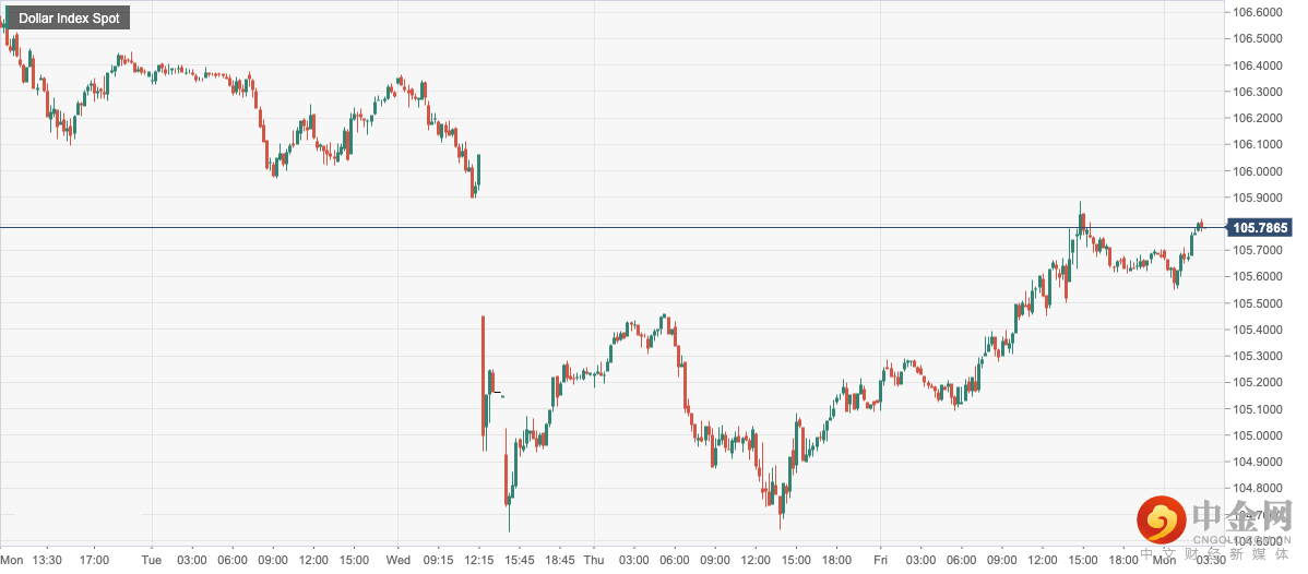 美元指数上周五收盘大幅反弹后,今日开盘涨至105.78附近,市场在权衡美国通胀数据改善与美联储官员的讲话,带动美元上行支撑。