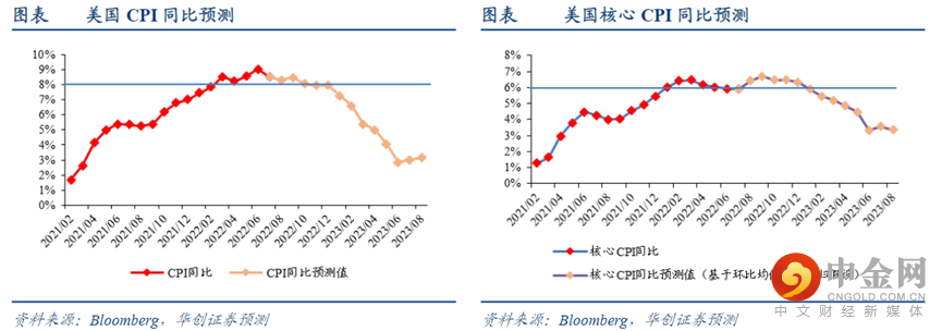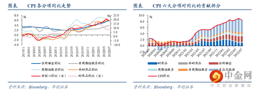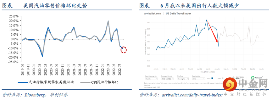 能源方面,受油价下跌影响,7月以来汽油零售价格持续下跌,带动CPI中的汽油价格环比下降7.7%。进入8月以来,汽油零售价格继续回落,截至8月8日最新资料,油价已从6月中旬5.11美元/加仑的高点回落至4.15美元/加仑,如果按照这个趋势外推,能源可能继续对8月通胀形成下行压力。