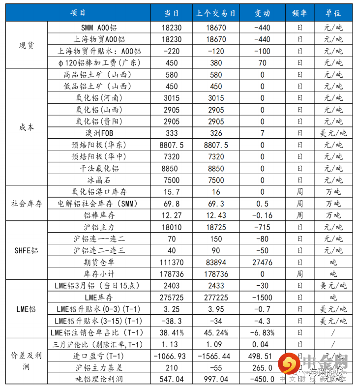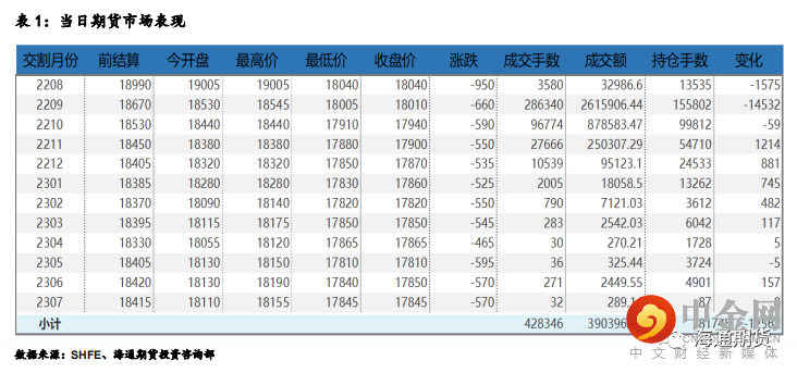 沪铝在隔夜跳空低开后延续走弱,主力合约 2209 收盘跌 660 元 至 18010 元/吨,跌幅为 3.54%,沪铝近月-连一价差回落至 30 元/吨低位。当日 15:00 收盘伦敦三月铝报价 2403.00 美元/吨。现货方面,华东地区成交集中在 18210-18250 元/吨,随着铝价走弱现货升贴水较上周五收窄 130 元至贴水 220 元/吨,出货情况较差;中原(巩义)地区成交集中在 18090-18130 元/吨,现货升贴水较上周五收窄 170 元至贴水 340 元/吨,观望情绪较浓刚需拿货为主。产业方面,截止 2022 年 8 月 15 日国内电解铝社会库存 69.8 万吨,较上周四库存增加 0.5 万吨,较 7 月底月度库存总计累库 2.9 万吨,较去年同期库存下降 4.4 万吨,同期来看仍处于低位。其中无锡地区因到货较少仍维持去库状态,巩义地区本周仍是累库。近期因电力问题,四川地区有减产,后续对华南地区到货或有一定影响。今日铝价持续走弱下行,一方面是宏观上国内社融数据大幅低于市场预期,地产数据也不及预期市场信心走弱,另一方面基本面上供应压力仍在。当下受四川减产影响产能增速较预期略有放缓,但仍不改增加趋势,预计 8 月底国内电解铝产量有望达 350 万吨附近。需求方面下游开工虽然小幅回升但仍处偏低位置,终端仍受地产板块拖累,现货市场成交拿货不佳,国内社会库存连续三周增加。整体上短期减产刺激支撑铝价,但供强需弱格局暂未改,预计铝价宽幅震荡,需关注库存变动和海外能源问题。