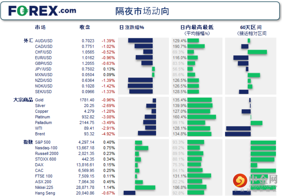 金属与能源普遍下跌。西得州和布伦特原油价格分别下跌3%和5%左右,而黄金形成看跌外包线并收于1783支撑位下方。