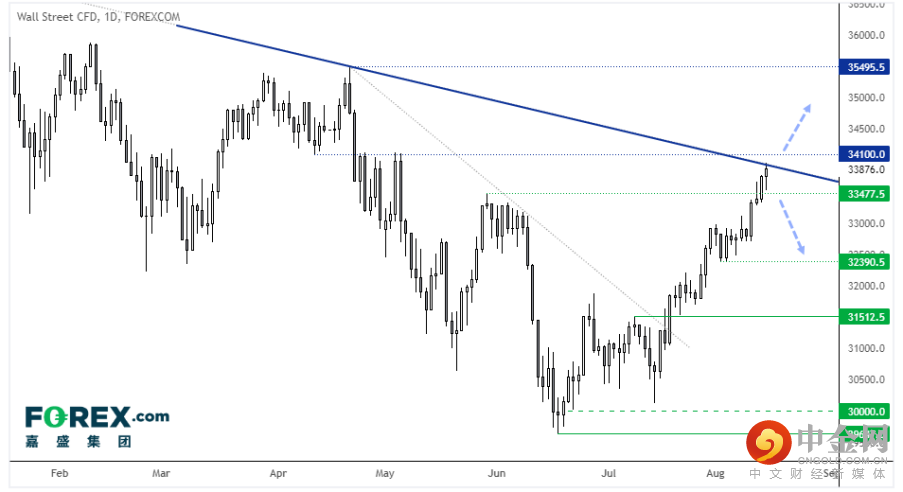 道指已自6月低点反弹15%左右,但反弹走势止步于趋势阻力。K线范围狭窄且带有上下影线,表明市场没有马上攻克趋势线的意愿。如果下破33,477,可假设期间顶部就位,后市目标33,500。假设重拾上涨趋势的前提是站上34,100高点。