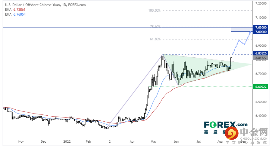 美元/离岸人民币日图于2月启动强上涨趋势,但5月以来一直处于区间横盘的状态。盘整过程中一直得到50天指数移动均线的支撑,而昨天的大阳线证实了上破对称三角形。该形态突破后的目标在7.000附近,其略低于历史阻力位和78.6%回档位。