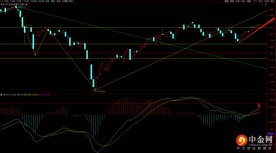 中证500表现强势,短期在没有出现明显滞涨的信号之前大概率还会继续攀升。注意观察下方6417点平台支撑。