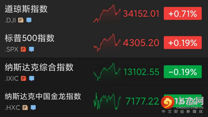 截至收盘,道指比前一交易日上涨239.57点,收于34152.01点,涨幅为0.71%,5月4日以来首次站上34000点;标普500指数上涨8.06点,收于4305.20点,涨幅为0.19%;纳指下跌25.50点,收于13102.55点,跌幅为0.19%。道指和标普500指数均创下4月底以来新高。