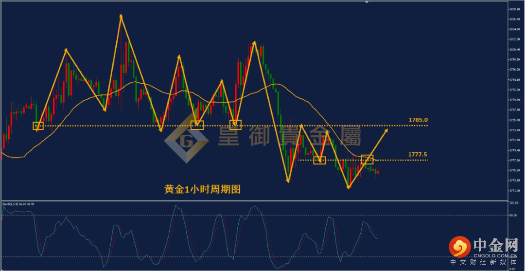从黄金1小时周期图来看,黄金自从跌破1785的整理平台后,在低位维持小幅震荡。黄金短期维持低位震荡,波动幅度较小。市场整等待新的趋势形成。短期来看,黄金可以关注昨天整理区间的中轴位1777.5,该位置成为近期震荡的多空分水岭,如站上该位置,黄金多头有望向上方1785.0附近发起攻势。目前黄金30日均线与中轴线重合,突破后继续上涨概率较高,建议投资者尝试突破后追击多单。