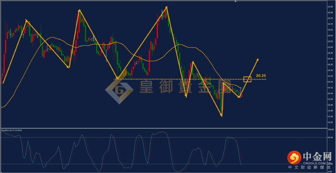 从下方白银1小时周期图看,白银维持高低点震荡下行的下跌趋势。昨天白银的反弹受到30日均线的压制,短期震荡结构逐渐收敛。白银Stoch技术指标已经接近20附近,预计短线下跌空间有限。投资者可以关注前期小高点20.25附近。白银如若突破此位置则打破高低点下移的节奏,有望形成形态反转。因此,建议投资者突破20.25后布局多单。