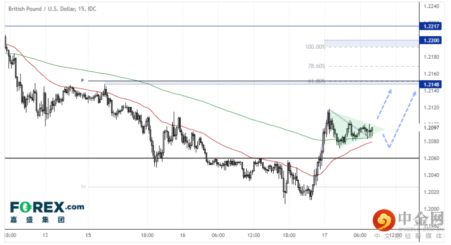英镑/美元此前自1.2000附近低点强力反弹,现在15分钟图在一个潜在三角形内盘整。该形态的目标在1.2200下方不远处,但有可能先遇到1.2148高点附近的61.8%回档位阻力。200期指数移动均线目前构成支撑,如果价格回撤,我们将寻找在月图枢轴位上方构筑波段低点的证据。