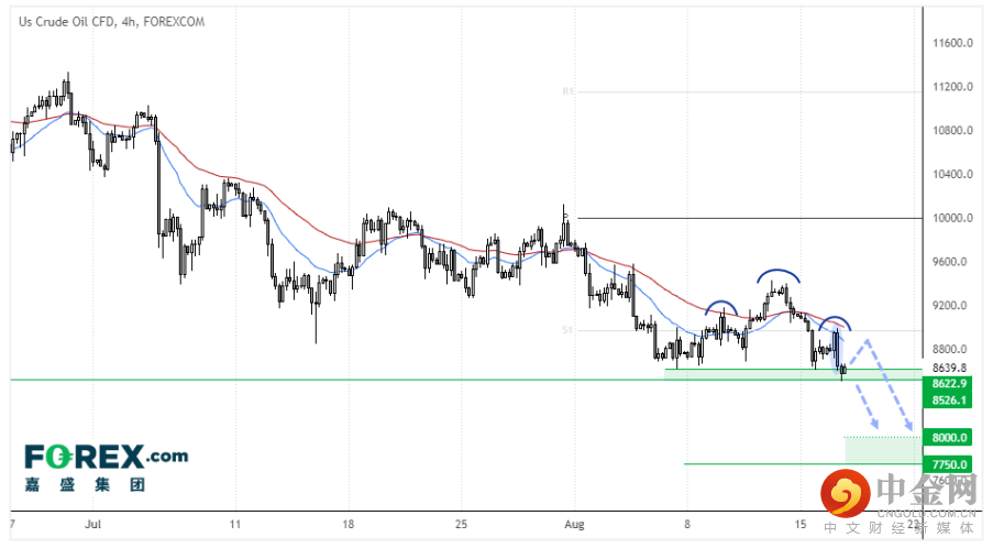 西得州原油4小时图的下跌趋势保持不变,目前尝试下破关键支撑位。价格已经形成潜在头肩顶形态,其出现于下跌趋势中暗示下跌延续。价格在20与50期指数移动均线下方形成看跌吞噬K线,也受制于周图第一支撑中枢。如果直接下破,则确认前述延续形态,剑指7750。当然,该位上方的8000也可能构成支撑。