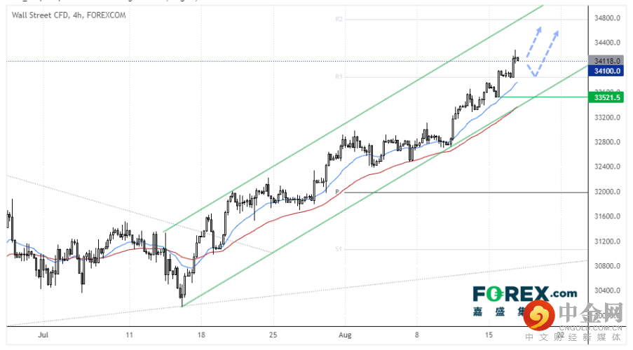 道指4小时图仍处于强劲的上涨趋势中,一直得到20和50期指数移动均线的支持。价格在月图第一中枢阻力位企稳后收上34,100的关键阻力,如果站上下个高点,涨势延续可期,目标月图第二枢轴位或上轨趋势线。价格如果回撤,我们将寻找在上涨趋势线一线、33,521低点或月图第一中枢阻力位企稳的证据。