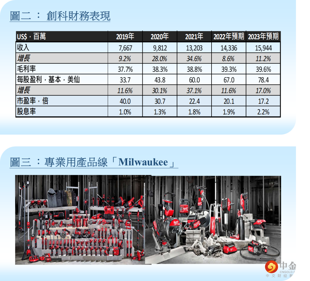 「Milwaukee」保持增長動力:相信創科旗下的專業用產品線「Milwaukee (請見圖三)」仍然是增長來源,而「Milwaukee」今年 2022 年預期 20% 低位 (low-20s)的 增長,亦部份反映其鞏固市佔率的能力。另外,整體產品的 2022 年上半年毛利率擴闊 50 點子,這有所紓緩對貨運和原材料價格上升、去庫存等的憂慮,而我們繼續憧憬明年 2023年整體產品的毛利率,有延續擴闊 50 點子的能力 (請見圖二) 。