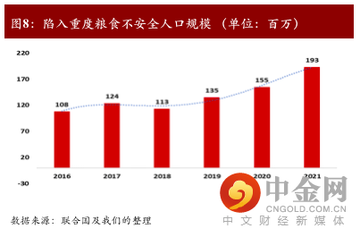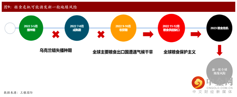 乌俄危机的高度不确定性或将引发新兴市场国家下半年出现粮食危机。长期以来,经济增速下滑、气候异常及军事冲突是造成能源及粮食危机的三大核心因素。受到乌俄冲突和主要粮食生产国(美国、法国、印度、澳大利亚等)夏季异常干旱的影响,2022/23年全球小麦产量预计为7.748亿吨,比21/22年减少450万吨,为近四年来最低水平(USDA,2022)。2022/23年全球玉米产量将从21/22年的高点12.2亿吨降至11.8亿吨,降幅约2.9%(USDA,2022)。与此同时,根据联合国最新数据(2022),2021年全球53个国家约1.93亿人正在经历重度粮食不安全状况(图8),这与2020年已经创纪录的人数相比,增加了近4000万人。其中,埃塞俄比亚、马达加斯加南部、南苏丹和也门超过57万人已经被归类为急性粮食不安全的最严重阶段,即灾难阶段,需要采取紧急行动来避免广泛的生计崩溃、饥饿和死亡。粮食供需不平衡加剧正在使得全球陷入粮食危机之中。粮食危机将冲击全球金融稳定性。单纯收紧货币政策对粮食或能源价格的抑制效果有限。考虑到2-3季度全球粮食主要出口国(如美国、巴西、阿根廷、乌克兰、法国及澳大利亚)受到气候、季节以及库存等因素影响,预计全球粮食价格下半年仍将进一步上涨。因此,无论对于大宗商品市场的多头还是空头而言,商品融资的需求仍有进一步抬升的可能性。若国际资本市场多空双方发起逼仓,来自交易对手方的追加保证金通知接踵到来,可能将引发市场流动性需求缺口加大,从而冲击金融市场稳定性。粮食危机将加剧全球贸易保护主义及地缘政治风险。根据国际粮食政策研究所(IFPRI)公布的数据显示,俄乌冲突已导致23个国家转向粮食保护主义,受限制农产品在全球食品贸易中所占比例达17%。受到欧美加息的影响,新兴市场国家年内或将面临资本外流压力,因此不排除部分大宗出口国将转向支持全球能源和粮食保护主义,通过以大宗价格优势对冲资本外流的风险。从品种来看,小麦出口受限对全球影响尤为显著。小麦作为全球最重要的粮食作物之一,也是全球40%国家的基本粮食作物,是保证全球“粮食安全”的基础。若更多的发展中国家和新兴市场因基本粮食作物短缺陷入严重粮食危机,不排除将引发更多地缘冲突问题。从历史经验来看,粮食危机将可能引发部分发展中国家出现社会动荡,并最终成为地缘战争爆发的导火索(图9)。