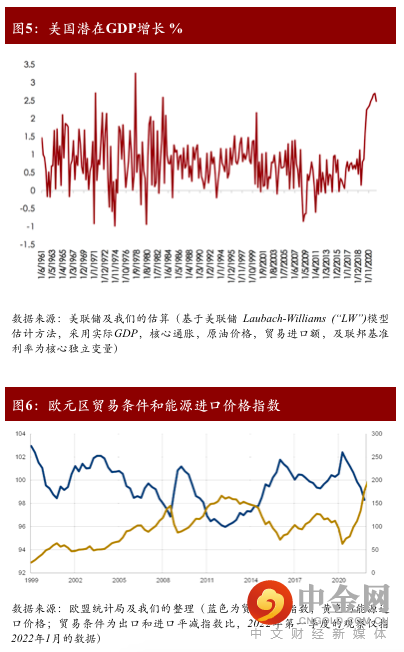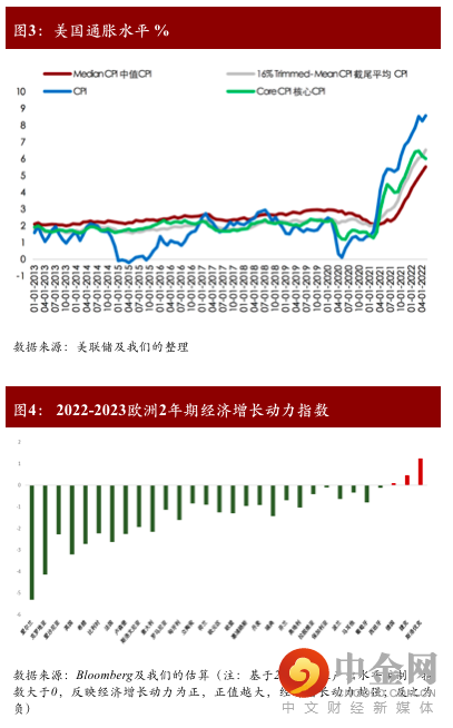 美国下半年经济最大的挑战:如何实现滞胀软着陆。尽管,美国中长期的通胀预期正在下降,但美国当前核心通胀和短期通胀预期仍然强劲(图3),其核心原因是美国已经陷入了“薪资-价格”螺旋陷阱。“薪资-价格”螺旋的出现一方面体现在积极财政导致家庭部门储蓄过剩,使得劳动参与意愿降低,另一方面体现在私人部门定价能力抬升,企业薪资抬升的外溢效应显著扩大。同时,工会议价能力有所抬升对公共部门薪资价格抬升提供了支持,因此劳动力市场供需不平衡加剧可能导致美国第二轮通胀。此外,美国地产市场火热,刺激今年以来全美租金进一步上行,对美国核心通胀提供了有力支撑。从整体通胀看,受到乌俄冲突以及中美需求提振的影响,预计美国整体通胀水平(主要指能源及食品价格)三季度仍将保持强势。总体来说,在货币政策收紧、财政政策对经济增长支持作用下滑的情况下,美国能否在高动态的全球环境中有效缓解劳动力市场供需失衡并有效维护金融市场稳定,将是避免美国直接由滞胀陷入经济衰退的关键。欧洲(主要指欧元区国家)经济滞胀预期将加速实质化。与美国不同,欧洲的高通胀在过去12个月内几乎一半受到来自能源和粮食价格飙升的影响,因此欧元区通胀的不确定性相比美国更高。随着原油价格和粮食价格的走强,预计欧元区通胀水平在下半年将进一步走高。另一方面,能源及粮食价格的攀升正在侵蚀欧洲经济增长动能,主要经济体产出缺口扩大将拖累欧元区整体经济复苏。例如,德国作为欧元区经济增长的火车头,其产出缺口较2010年欧债危机时期有所上行。根据我们的估算,2022年德国产出缺口预计为-1.1%,而欧债危机时期德国的产出缺口为-1%,意大利产出缺口预计与欧债危机时期一样维持在较高水平。进一步,我们基于欧元区各国潜在产出水平构建了欧洲(欧元区27国及英国)经济增长动力指数(图4),发现今明两年欧元区及英国整体经济增长动力或将进一步弱化,通胀上行和经济增长动力转弱导致欧洲滞胀风险正在加速实质化。欧美滞胀放大了地缘危机对新兴市场的通胀压力。一方面地缘冲击对新兴市场的能源和粮食价格造成普遍性冲击,另一方面欧美企业通过提高最终商品出口价格,将更高的成本转移给了其他新兴市场和发展中国家,使得欧美滞胀的外溢效应正在放大地缘冲突对新兴市场的价格冲击。预计今年年底,新兴市场总体通胀水平将较去年显著抬升,叠加欧美货币政策进一步收紧,新兴市场将面临来自供需两端更多的不确定风险,终将拖累新兴市场国家经济的持续反弹。