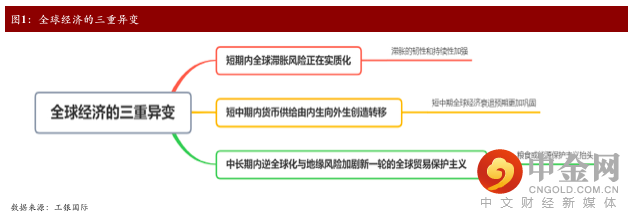 回顾2022年上半年,受到乌俄局势冲击,全球经济在后疫情阶段恢复受阻。展望2022年下半年,我们认为全球经济正在经历三重异变。在三重异变的作用下,美国通胀波动呈现高度不确定性,下半年滞胀能否实现软着陆更加扑朔迷离。追随美国步伐,欧洲高通胀压力显现,能源价格已经严重侵蚀欧洲经济,导致欧洲滞胀实质化风险正在形成。对于新兴市场或发展中国家而言,欧美滞胀的外溢效应以及粮食保护主义加剧,或对新兴市场经济活动造成新的威胁。为了应对三重异变下欧美国家及新兴市场所各自面临的风险,预计美联储和欧洲央行下半年将进一步把控制通胀放在首要任务,欧美货币政策同步加速收紧将是大势所趋。新兴市场在全球资产大幅调整的背景影响下,一方面将同步加息以抑制通胀并防止资本外流;另一方面部分大宗出口国或将转向支持全球能源和粮食保护主义,通过大宗出口国的价格优势以对冲资本外流及货币贬值的风险。然而,从全球性的角度来看,全球粮食供需不平衡加剧正在导致更多的国家陷入粮食危机之中,若中长期内更多的发展中国家和新兴市场陷入严重的粮食短缺,不排除地缘饥荒引发新一轮军事冲突的可能,届时全球经济可能将受到更加严重的冲击。
