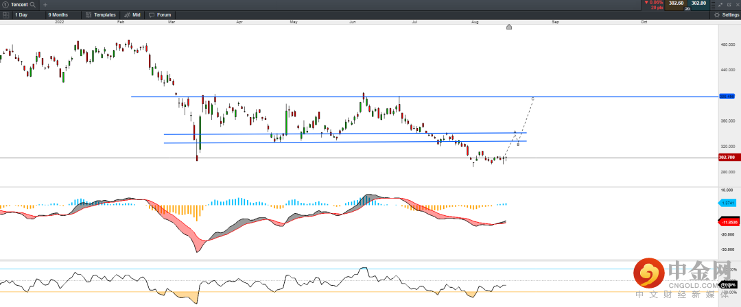 近期腾讯股价呈现底部震荡趋势,并有企稳之势。