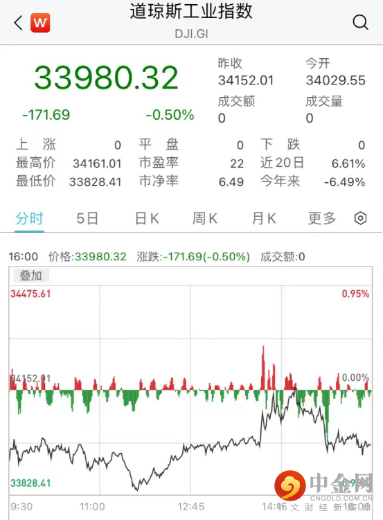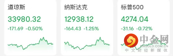 截至收盘,道指跌0.5%,收跌171.69点,报33980.32点,终结五连涨;纳指跌1.25%,报12938.12点;标普500指数跌0.72%,报4274.04点。