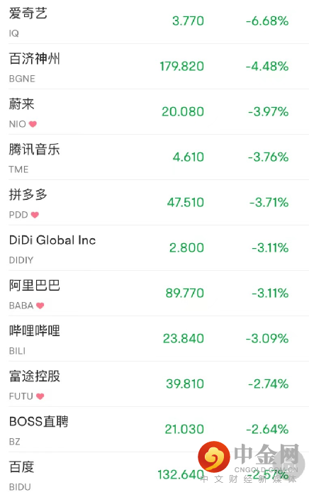 爱奇艺跌近7%,百济神州跌4.48%,腾讯音乐跌3.76%,拼多多跌3.71%,阿里巴巴跌3.11%,B站跌3.09%,百度跌2.57%。